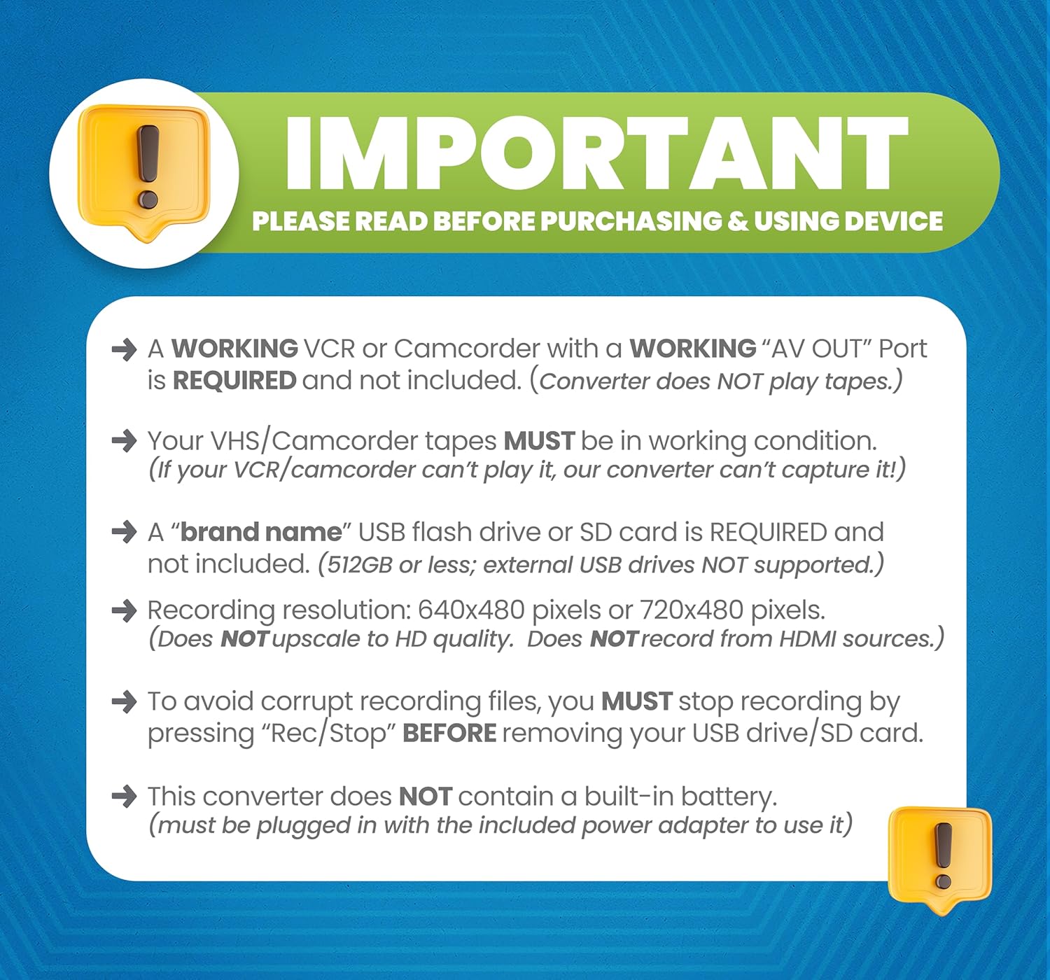 Perfect for digitizing family videos, editing in your favorite software, uploading to social media, or simply backing up your memories before tapes degrade.