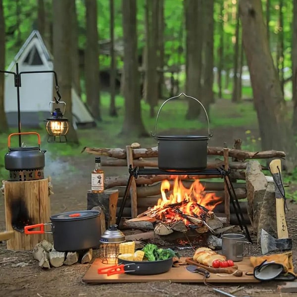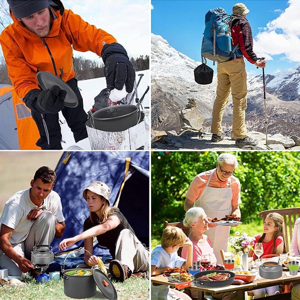The non-stick aluminum pots, pans, and kettle heat up fast and cook food evenly. Enjoy hassle-free cooking and effortless cleanup wherever you are.