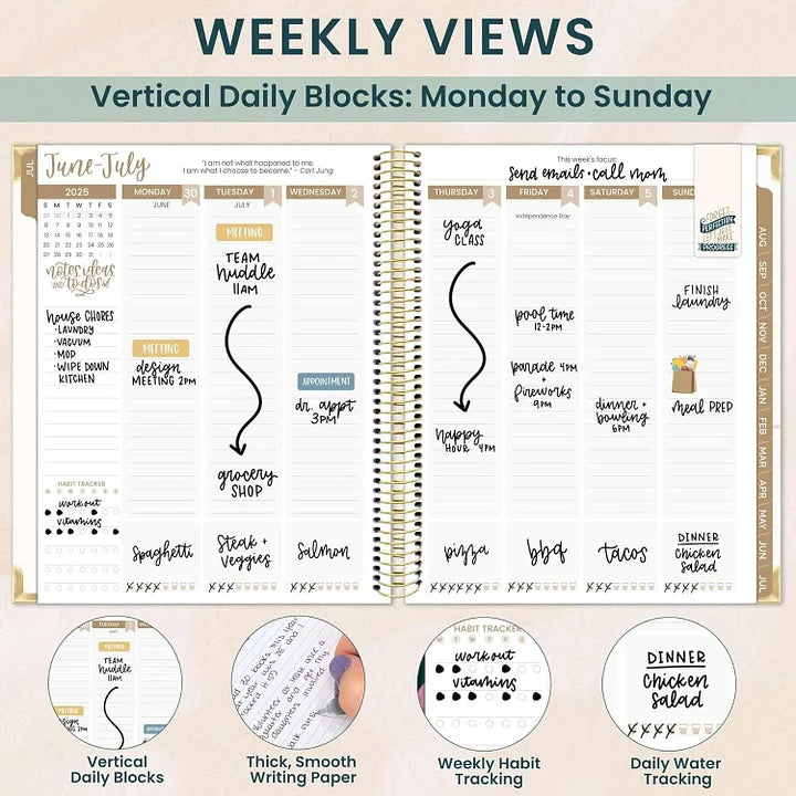 Dedicated daily habit trackers and goal-setting prompts help you build better routines and keep your long-term vision in sight.