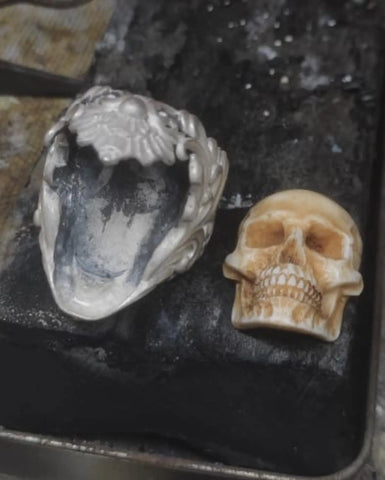 At its heart, this ring features a lifelike skull meticulously carved from premium, high-density deer antler. This skull, encased within an intricate floral ornament silver ring band, demands attention and admiration. Its stunning realism is bound to leave onlookers in awe.