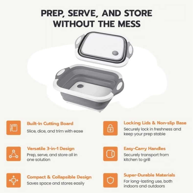 When not in use, the prep tub collapses flat for easy storage in cabinets, drawers, or RV spaces — no bulky containers taking up kitchen real estate.
