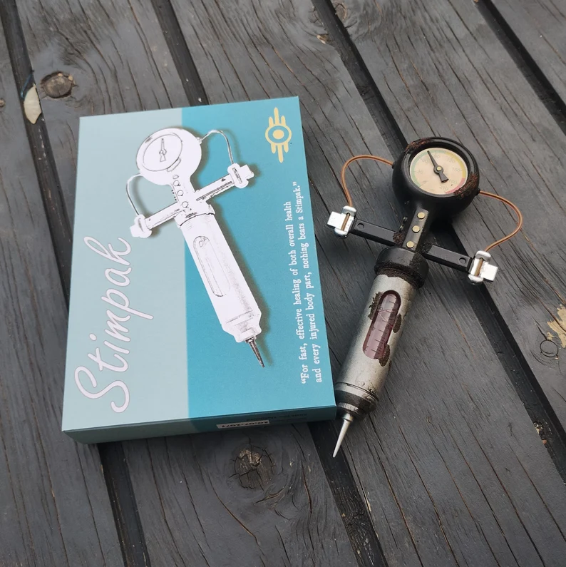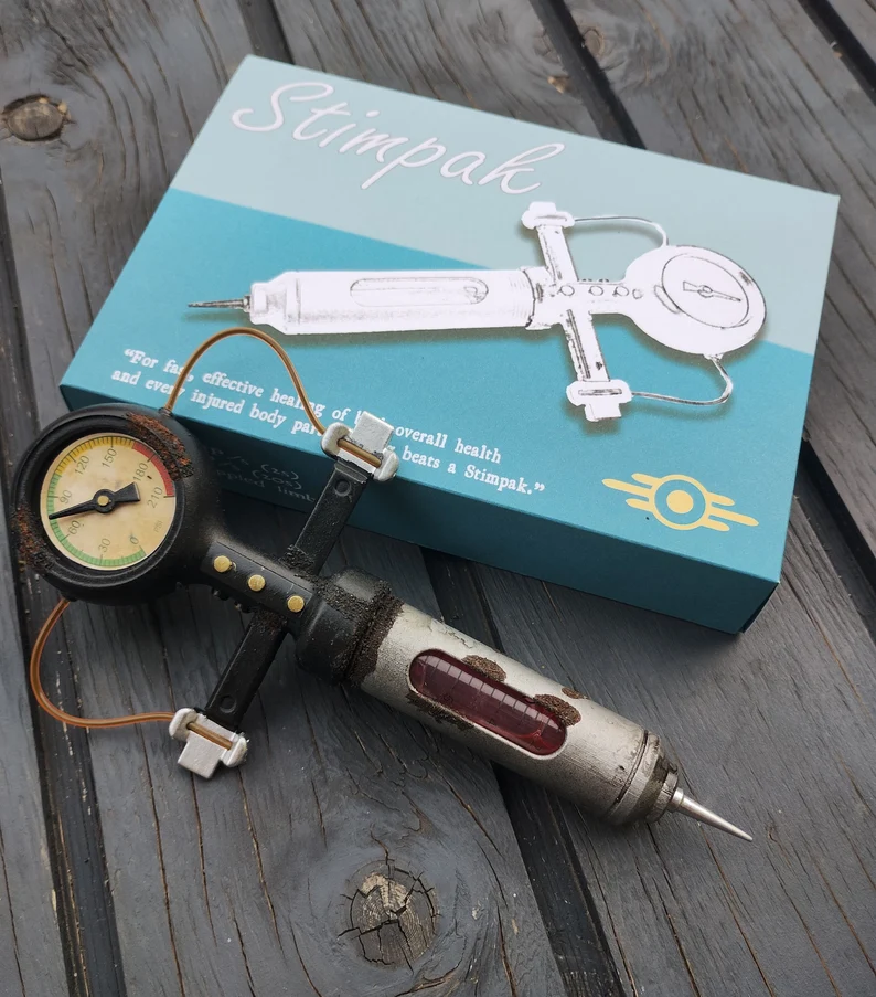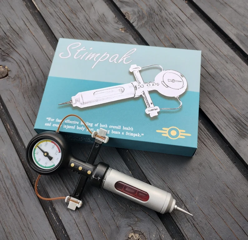 Meticulously designed to replicate the Stimpak as seen in Fallout, featuring simulated medical labels, vibrant coloring, and a retro-futuristic style that fans will instantly recognize.
